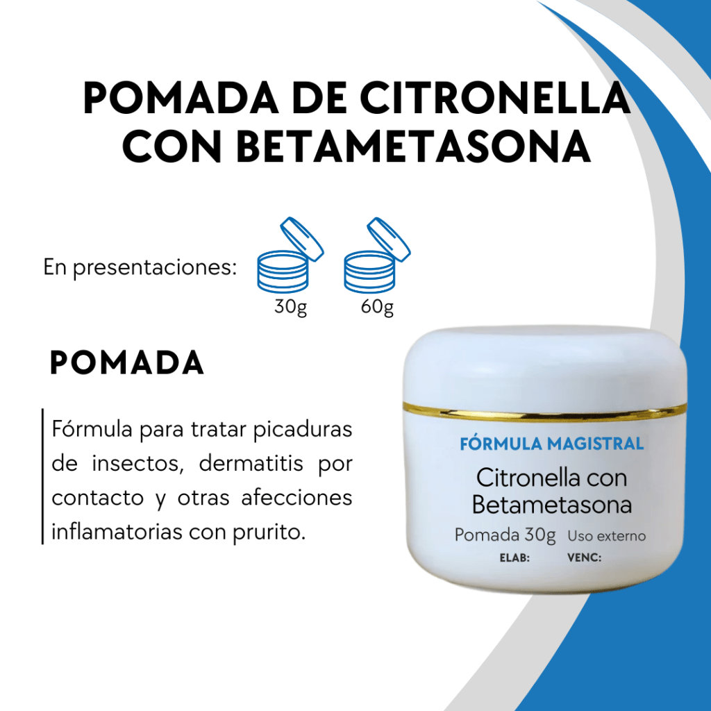 La citronella es un repelente natural y la betametasona un potente corticoide antiinflamatorio.