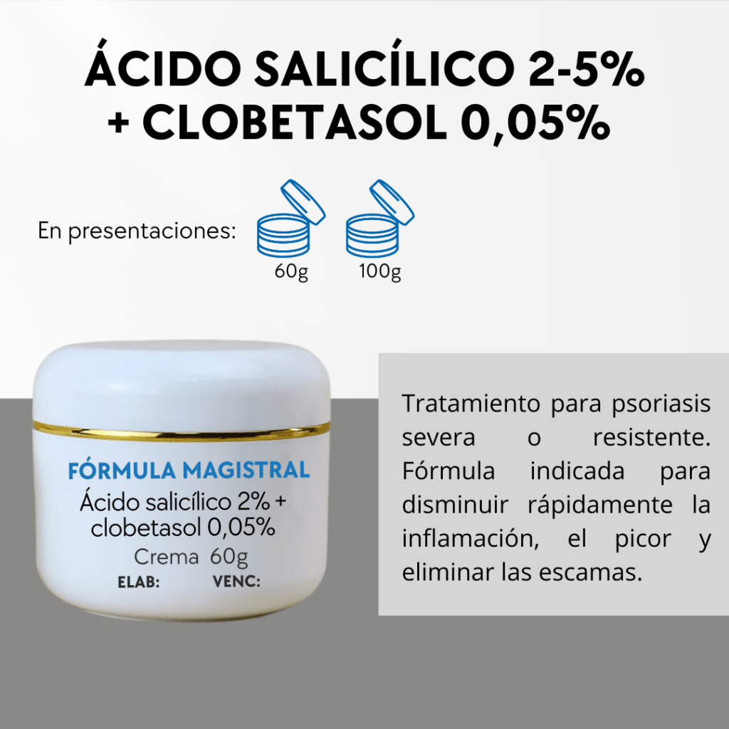 Aplicar Ácido Salicílico + Clobetasol una vez al día en psoriasis, máximo 14 días sin supervisión médica, evitando zonas sensibles.