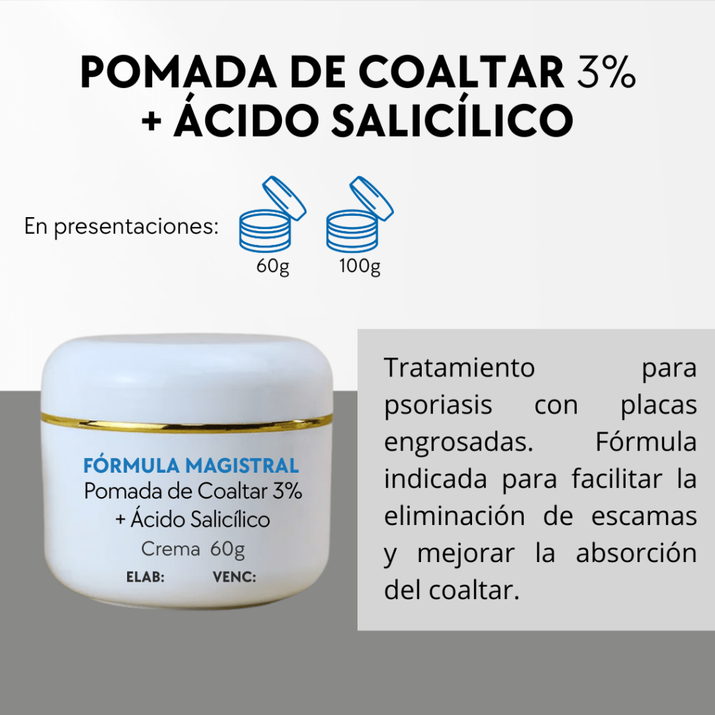 Pomada de Coaltar + Ácido Salicílico aplicar en la piel afectada uno o dos veces al día. Puede usarse con otros tratamientos o fototerapia.
